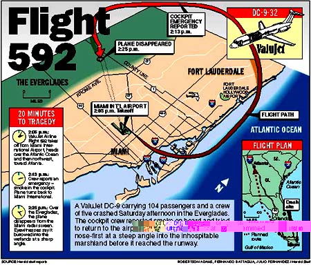 | Jet crashes near Miami Rescue crews unable to find any survivors   By MANNY GARCIA, JOANNE CAVANAUGH, AMY DRISCOLL and TED REED Herald Staff Writers They used airboats and helicopters. They dodged snakes and alligators. But the rescuers who desperately searched the Everglades muck for survivors of South Florida's worst plane crash soon came upon the grim reality: None of the 109 people on board a ValuJet DC-9 survived Saturday when their plane slammed into the earth west of Miami International Airport. Today, the grimmest of tasks continues -- assessing the crash toll by combing the Everglades debris. Chris Aguirre, a Metro-Dade hazardous material technician, was one of the first on the scene Saturday. "I saw a family album floating on the water. It depicted a mother with small children. My first thought was about my family and then I thought about the last seconds before the plane crashed," Aguirre said. The feeling of hopelessness struck even harder at families of the passengers: "There doesn't seem to be any hope,'' said Stewart P. Thomas of Coral Gables, whose daughter, son-in-law and granddaughter were on the jet. "The screens on TV have gotten pretty close. I can't see any metal larger than a dishpan." Firefighters, paramedics and police officers -- who have trained for just such a tragedy -- could do little but sweat and slosh through mud. At times, it seemed only the dragonflies and mosquitoes easily visited the wreckage. Bodies were sighted, but fuel that could have been easily ignited and the natural terrain hampered rescue efforts to the point where even airboats were eventually prohibited from skimming the river of grass to help. "It is just all swamp and sawgrass. It will probably take three or four days to clean up. It will all have to be all done by airboat," said John Esslinger, a state wildlife officer. "It is going to be ugly out there. It's not going to be pleasant, that is for sure." Television news helicopters circled the site all afternoon, showing South Florida and the world the same bleak view: bits of debris dotting the shallow water and hammocks. ValuJet Flight 592 took off from Miami International at 2:05 p.m. -- one hour late -- with 104 passengers and a crew of five, said Federal Aviation Administration spokeswoman Christy Williams. The DC-9, one of aviation's great workhorses, was scheduled to land one hour and 55 minutes later in Atlanta. Instead, after about 20 minutes, the white, blue-and-yellow aircraft bored into the ground like a power drill. "What we have is a high-impact crash," said a somber Luis Fernandez, spokesman for the Metro-Dade Fire Department. The FAA's Williams gave this account of Flight 592's last minutes: The DC-9 took off to the east and then turned northwest. It had traveled less than 100 miles from Miami when the crew radioed Miami traffic controllers to report smoke billowing into the cockpit. The plane had been airborne eight minutes.Turning around The jet, then at an altitude of 10,500 feet, turned around and tried to make it back to Miami International. At about 2:25 p.m., Miami air traffic control lost Flight 592 from its radar screens. The plane went down, apparently nose first, about 14 miles northwest of Miami International. It crashed in a desolate area of wet earth, grass patches and trees. A private pilot from Miami Beach who was flying west at the time said he saw the plane go down. Daniel Muelhaupt said he was about two miles from the jetliner, flying toward Naples, when he saw what he at first thought was a small plane doing maneuvers. The plane was pointing down at an angle of about 75 degrees. "When it hit the ground, the water and dirt flew up,'' Muelhaupt said. ``The wreckage was like if you take your garbage and just throw it on the ground, it looked like that. On the ground, Sam Nelson and Chris Osceola said they were on a bass boat fishing on the L-67 Canal about a half-mile from the crash when they saw the plane begin to falter. "The plane was going when all of a sudden it just made a right turn. I don't know what it was doing. It looked like it was trying to go back up. It was pretty low,'' said Sam Nelson, 52, of Hollywood. ``It kinda turned sideways, then it just nose dived, right down straight into the swamp.'' The two men brought the boat to land and ran up on the levy to look, thinking they could help.'Big explosion' "The last thing we saw was the tail end going down," Nelson said. "Then it hit and there was a big, big explosion. You could hear the motor, like it was under full power. That thing hit so hard you couldn't even see it. "After the explosion went away, there was no smoke. It was like nothing ever happened." Muelhaupt, the small-plane pilot, said he radioed authorities and circled the crash site until rescuers reached the scene, which took about a half hour because there were no visible flames or large chunks of aircraft to focus on. Helicopters from the U.S. Coast Guard, Metro Police and the Dade fire department circled the crash site and reported no signs of survivors, just minuscule pieces of shredded metal, baggage, bodies and a taut crater shaped like a jagged candle flame. "Access was a major, major problem. The plane was broken up into many pieces and submerged in 4 to 5 feet of water," said Metro-Dade's Fernandez. The site is very close to where an Eastern Airlines L1011 crashed in 1972, the worst local air disaster before Saturday. While rescuers searched in vain, distraught relatives of passengers rushed to the ValuJet counter at Miami International. Company officials quickly moved them to an auditorium, where counselors were available to help them deal with their loss. At Gate G-2, a sign announcing the departure of Flight 592 still was listing it as "On Time." Saturday afternoon, ValuJet's president spoke from Atlanta. "It's impossible to put into words how devastating something like this is," said Lewis Jordan, president and chief operating officer.Checkered past Atlanta-based Val