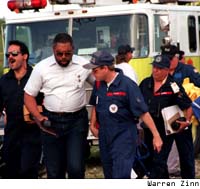 RETURNING FROM THE SCENE: Members of the NTSB and FAA are ushered back to incident command after viewing the scene first hand.